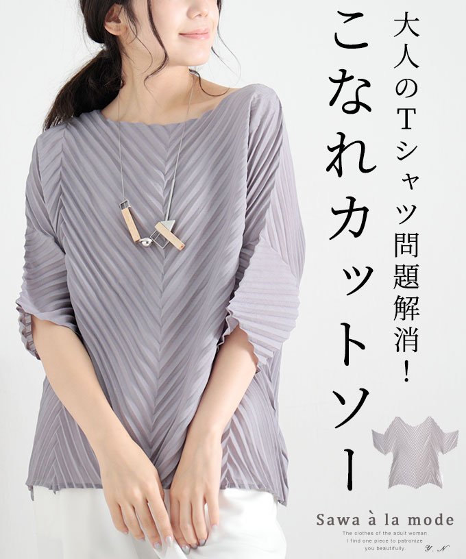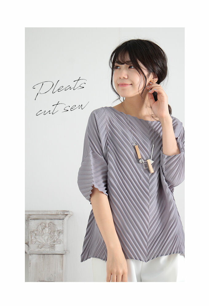 斜めアコーディオンプリーツトップス カットソー 半袖 5部袖 バイアス グレー グレイ Uネック 夏 夏服 レディースファッション M L Mサイズ Lサイズ 9号 サワアラモード アラモード sawaalamode 可愛い服 otona kawaii かわいい服 かわいい 可愛い