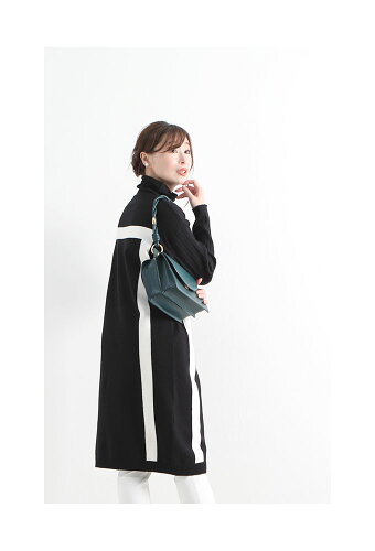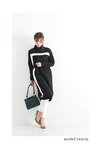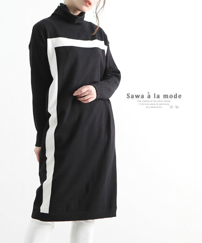 白いラインがお洒落な黒ニットワンピース レディース ファッション ワンピース チュニック 黒 ブラック 膝丈 長袖 秋 大人可愛い 40代 レディースファッション 50代女性 ファッション 60代 ミセスファッション サワアラモード sawa a la mode otona