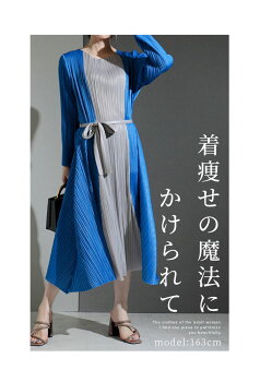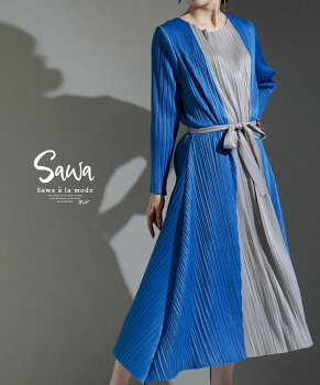 配色アコーディオンプリーツワンピース レディースファッション ドレス ブルー 青 長袖 春 秋 冬 着痩せ 体型カバー ロング マキシ リボン エレガント 30代 40代 50代 60代 サワアラモード sawaalamode otona 大人 kawaii 可愛い 洋服 かわいい服【5月5日20時販売新作】